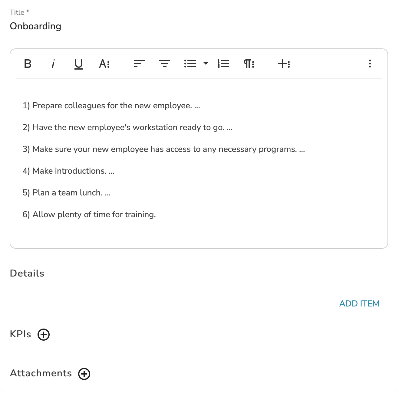 Create checklists, assign responsible parties to steps and sub-steps, track performance, add links and attachments, and more.