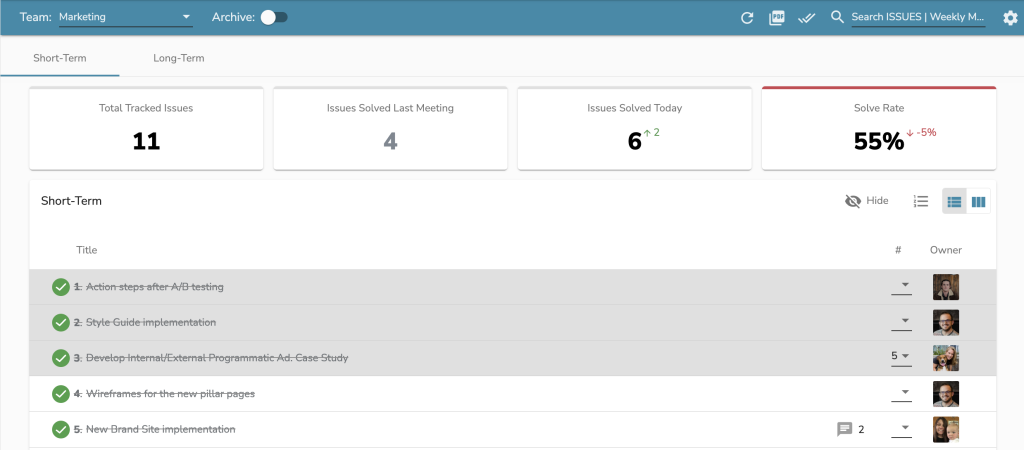 Run more effective meetings by tracking the percentage of Issues solved. Our new Issues dashboard will have people ready for engaging discussions that lead to resolving more Issues in your meetings.